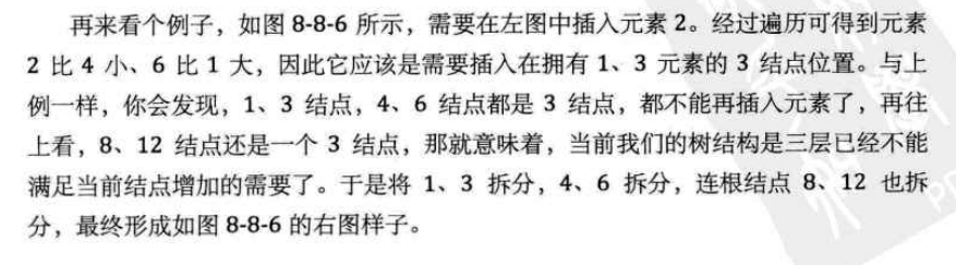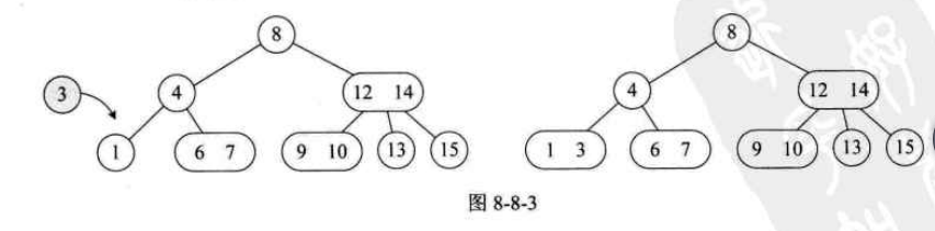 \quad \quad 对于B树来说,与二叉搜索树相同,插入操作一定是发生在叶子节点上。可与二叉搜索树不同的是,B树插入一节点的过程可能会对该树的其余结构产生连锁反应。关于B树的插入操作,和2-3树一样,只不过阶数可能会大了些。
