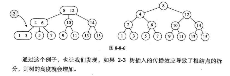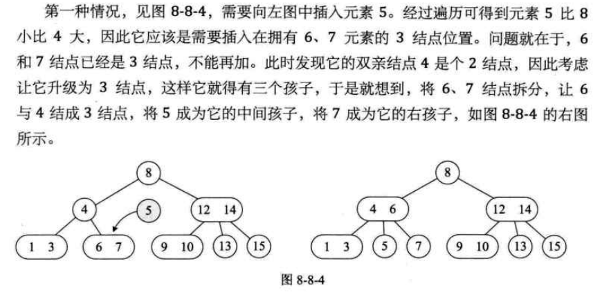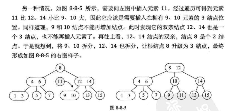 另一种情况,插入结点到3结点的叶子,其双亲结点为3结点,其祖父结点为2结点,则将其祖父结点变为3结点,拆分插入结点的3结点和双亲结点都变为2结点,同时保持所有的叶子结点都在同一层次上。